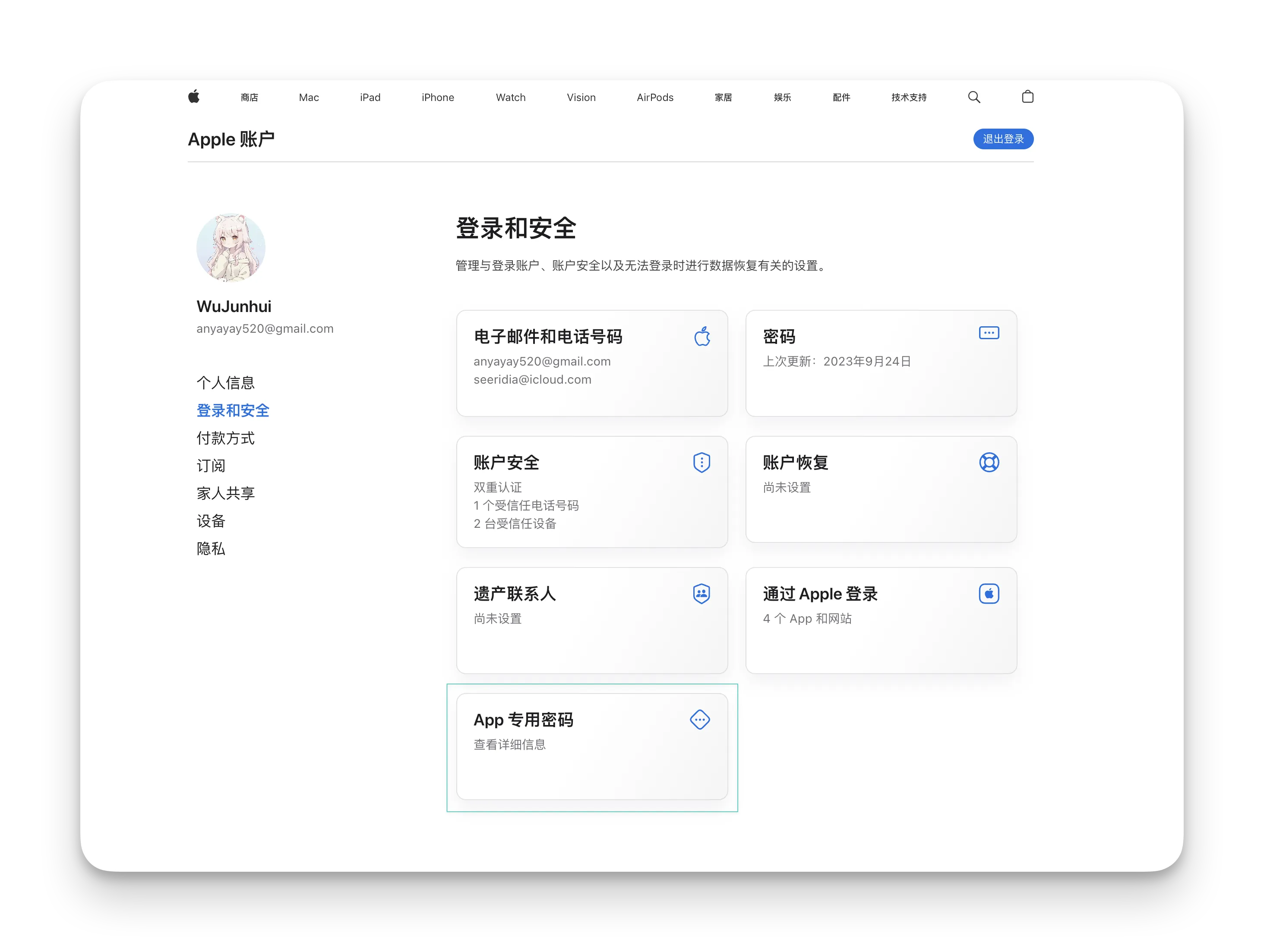 按照提示生成一个新的「App 专用密码」并记住他,我们将在后续步骤中使用它。