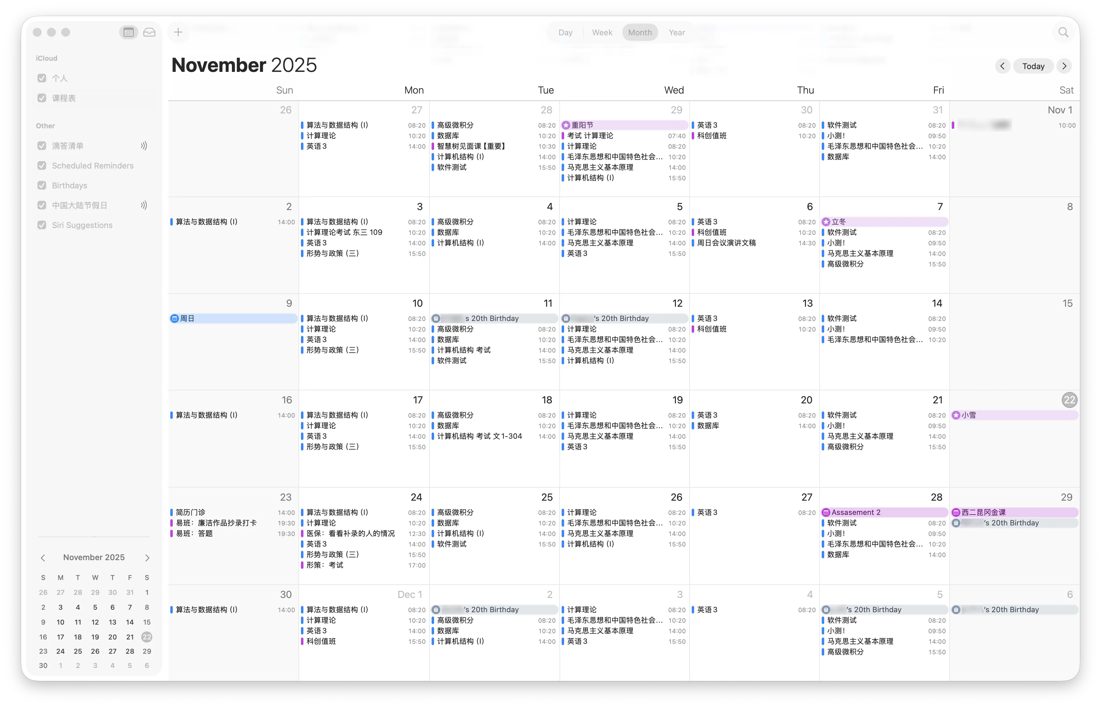 对于其他学校的同学,如果学校没有提供类似的课程表订阅功能,可以考虑自己手动录入,或者不在日历里面做这个日程分类,用你们自家的课程表 App 或是小程序还是 Wakeup 之类的来查看上课时间。我自己的这个主要是为了能在一个表里面看到包含课程表在内的所有日程,方便我去安排,而非日历看一下,自己的 App 看一下,这不优雅~