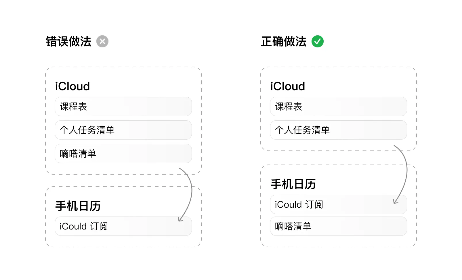 这边的左图是不要把嘀嗒清单订阅添加到 iCloud 上面去(但是可以添加到 apple 设备的本地日历)